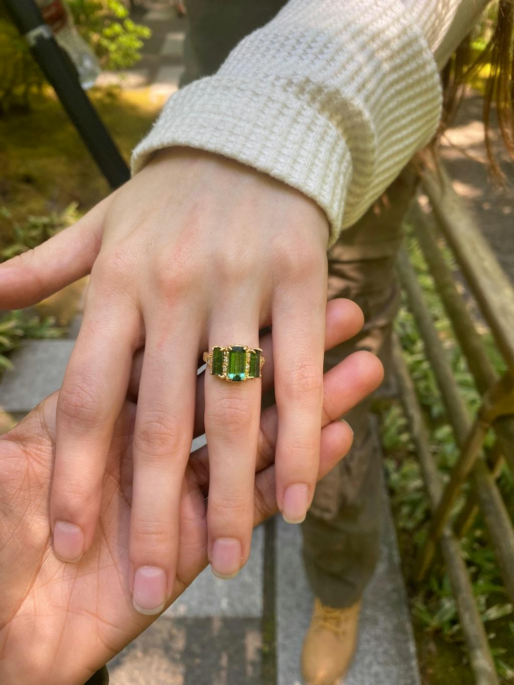 After I stumbled across her original designs and one-of-a-kind rings that she makes using a lost-wax technique, I knew she would be the perfect jeweller for my fiancé’s engagement ring, and to bring my rough ideas to life. I threw 5 pages of ideas at her and after a few rounds of sketches and multiple back and forths, we came up with a timeless ring (emerald cut centrepiece) with a few unique twists (a salt and pepper side stone and 3 engraving lines down either side).