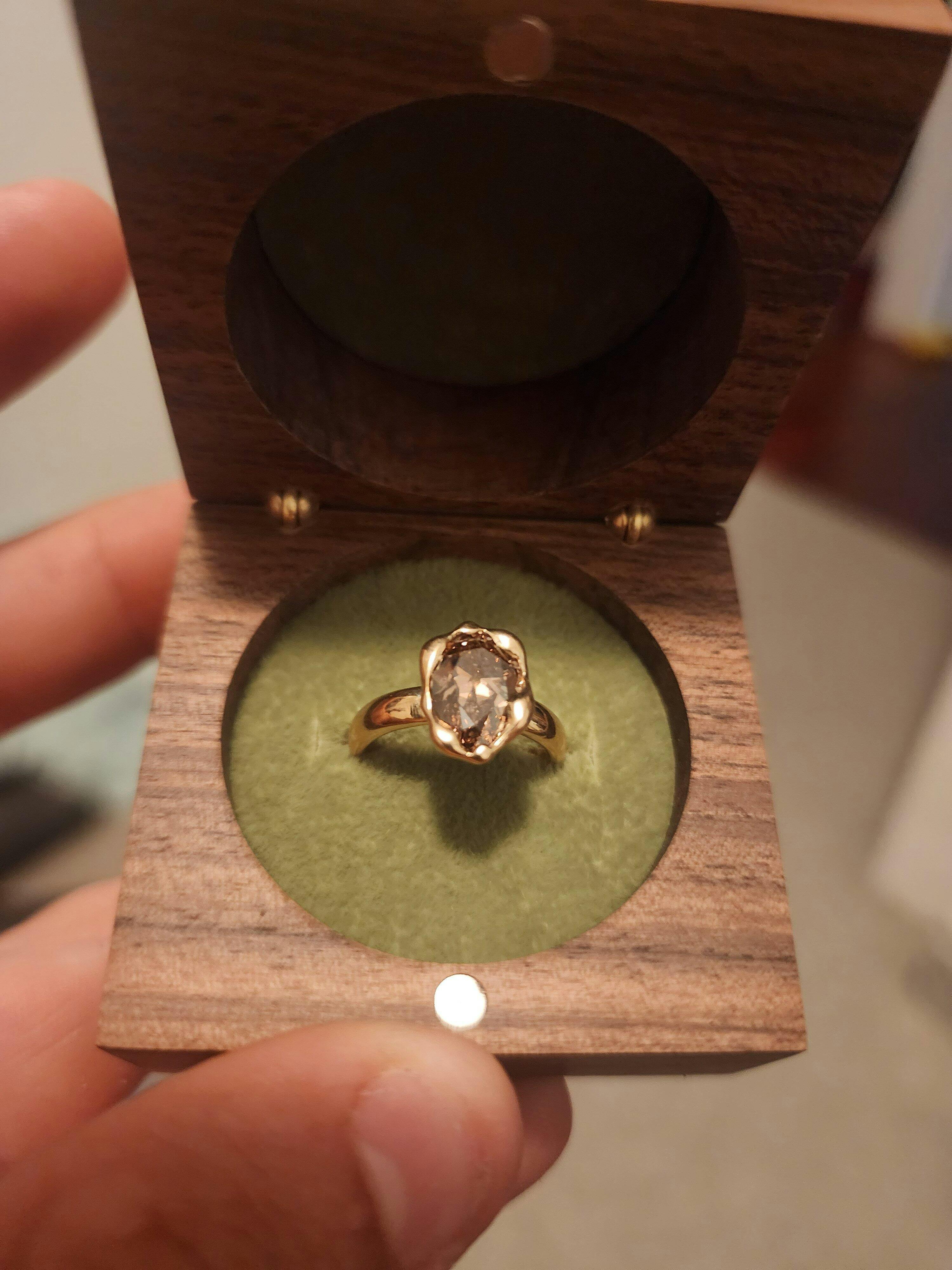 "Filippa did such a wonderful job bringing my ideas to life, while staying true to her own unique style (I love her style and that’s why I chose to ask her to make my engagement ring, after all!) She was perfectly communicative and open through the design process, happy to share her knowledge of materials, and gave me an honest and accurate timeline from design to finished piece. I couldn’t be happier. I think I’ll still be starstruck staring at my ring 40 years from now."