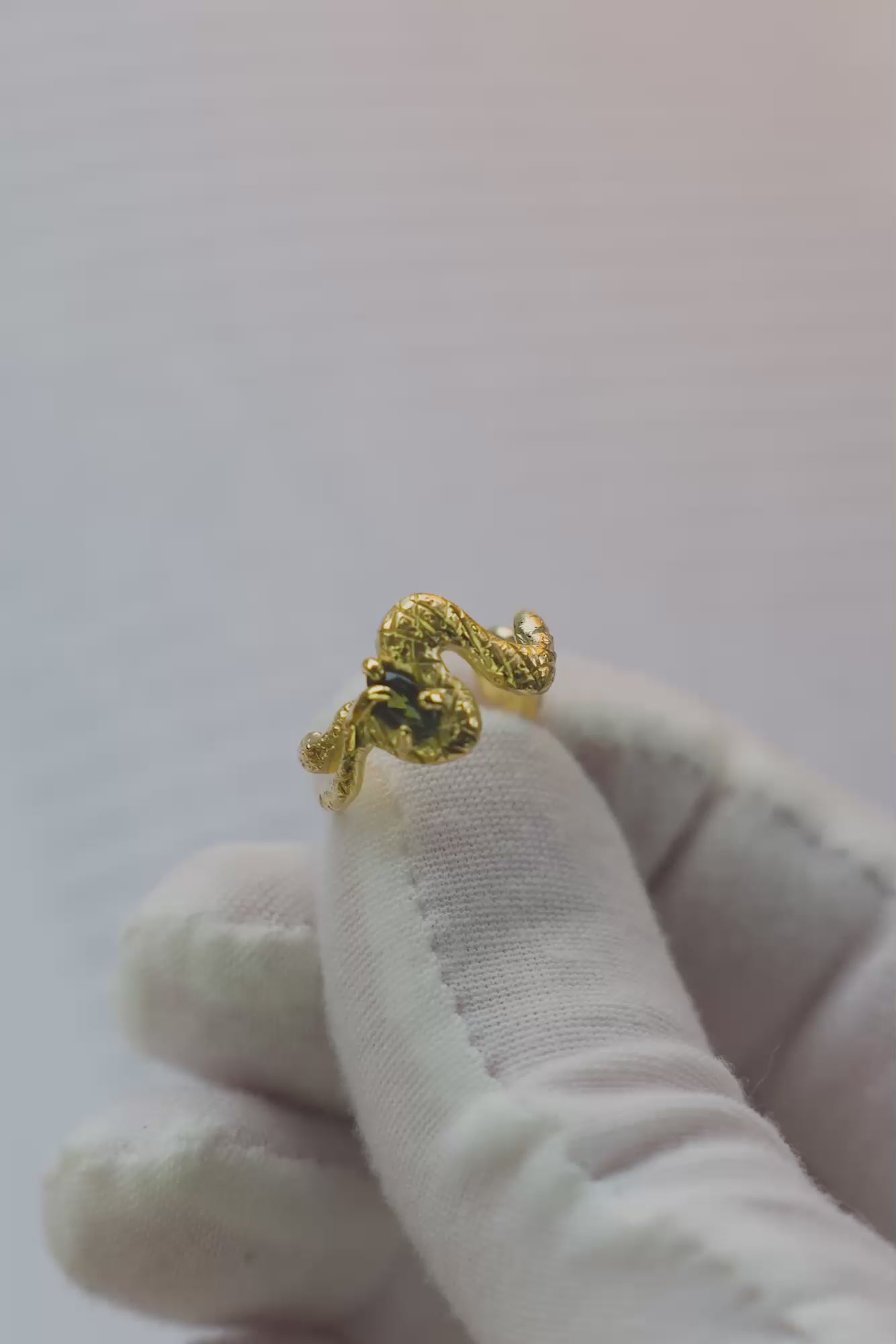 Embodying the essence of the serpent's symbolism, this luxurious piece showcases a lustrous Australian tourmaline adorned on a serpent ring crafted in a mesmerising wave design. Its intricate engravings add a touch of uniqueness, making it a truly versatile and sophisticated statement piece.